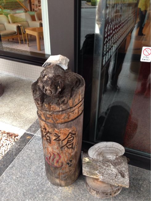 宿の入り口に温泉に浸かってる木彫りの猪がかわいい。